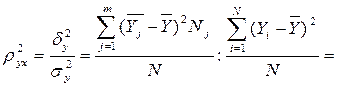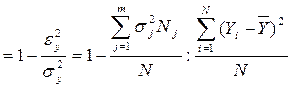 Эмпирическое корреляционное отношение, r - показатель тесноты связи, рассчитываемый как корень из эмпирического коэффициента детерминации. Область допустимых значений эмпирического корреляционного отношения от 0 до +1. При достаточно тесной связи между признаками эмпирический коэффициент детерминации стремится к 1. При слабой связи – к нулю. Расчет характеристик: Эмпирический коэффициент детерминации: