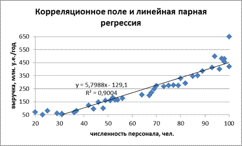 Аналитическая группировка для признаков численность персонала (X) и выручка (Y) представлена в табл. 6. 3. Эмпирическая линия регрессии Для построения эмпирической линии регрессии (рис. 4) требуются данные аналитической группировки (табл. 6). Число точек эмпирической линии регрессии равно числу групп (5).