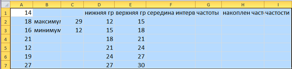 В ячейки D2-D9 вводим нижние границы интервалов группировки – числа 12, 15, 18, 21, 24, 27. В ячейки E2-E9 вводим верхние границы интервалов группировки – числа 15, 18, 21, 24, 27, 30. В столбце F вычислим середины интервалов: для этого в ячейку F2 ставим курсор и вызываем функцию из категории статистические СРЗНАЧ(AVERAGE), в качестве аргументов функции задаем диапазон D2:E2. Выделяем ячейку F2 и мышкой, удерживая правый нижний угол, протаскиваем до ячейки F9, тем самым копируем введенную формулу на весь диапазон F2-F9. Для вычисления частот ni используют функцию ЧАСТОТА(FREQUENCY), находящуюся в категории Статистические (Массив)». Введем ее в ячейку G2. В строке «Массив данных» введем диапазон выборки (ячейки А1-А25). В строке «Массив интервалов» введем диапазон верхних границ интервалов группировки (ячейки E2-E7). Результат функции является массивом и выводится в ячейках G2-G7. В Excel для полного вывода (не только первого числа в G2) нужно выделить ячейки G2-G7, обведя их мышью, и нажать F2, а далее одновременно CTRL+SHIFT+ENTER. Результат – частоты интервалов 3,4,9,5,2,2.