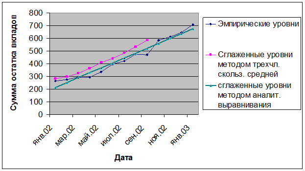 Из таблицы видно, что остатки вкладов увеличиваются равномерно, поэтому для аналитического выравнивания применяется функция