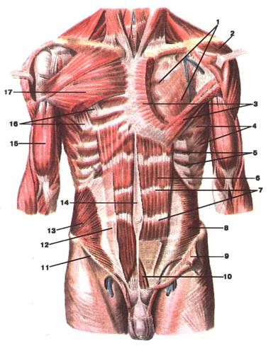 Малюнок А. 2 – М'язи тулуба (грудей та живота). Вигляд спереду: 1 -lamina profunda fasciae pectoralis; 2 -m. deltoideus (відтягнутий вбік); 3 -m. pectoralis major (частково видалений); 4 -m. serratus anterior; 5 -mm. intercostales interni; 6 -m. rectus abdominis; 7 -intersections tendineae; 8 -m. transversus abdominis; 9 -m. obliquus internus abdominis (відрізаний та відвернутий); 10 -m. pyramidalis; 11 ‑lig. inguinale; 12 -aponeurosis m. obliqui interni abdominis; 13 -m. obliquus internus abdominis; 14 -linea alba (abdominis); 15 -m. biceps brachii; 16 -m. pectoralis minor; 17 -m. pectoralis major