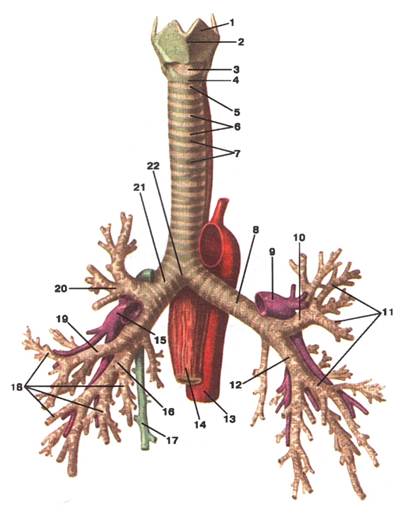 Малюнок А. 3 – Trachea et bronhi. Вигляд спереду: 1 -cartilago thyroidea; 2 -prominentia laryngea; 3 -lig. cricothyroideum; 4 -cartilago cricoidea; 5 -lig. cricotracheale: 6 -ligg. anularia; 7 -cartilagines tracheales; 8 -bronchus principalis sinister: 9 -а. pulmonalis sinistra; 10 -bronchus lobaris superior sinister; 11 -bronhi segmentales; 12 -bronchus lobaris inferior sinister; 13 -aorta; 14 -oesophagus; 15 -a. pulmonalis dextra; 16 -bronchus lobaris inferior dexter; 17 -v. azygos; 18 -bronchi segmentales; 19 -bronchus lobaris medius dexter; 20 -bronchus lobaris superior dexter; 21 -bronchus principalis dexter; 22 -bifurcatio tracheae
