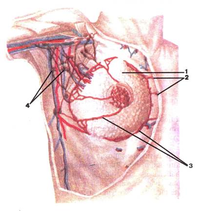 Малюнок А. 6 – Лімфатичні судини та вузли грудної залози. Вигляд спереду: 1 -mamma; 2 -nodi lymphatici parasternales; 3 -vas lymphaticum; 4 -nodi lymphatici axillares