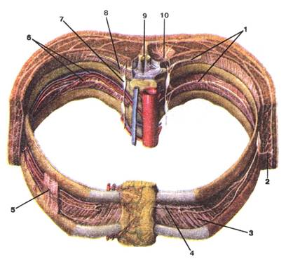 Малюнок А. 10 – Nervi intercortales: 1 -nn. intercostales; 2 -r. cutaneus lateralis; 3 -m. intercostalis internus; 4 -r. cutaneus anterior; 5 -m. intercostalis externus; 6 -arteria et vena intercostales posteriores; 7 -truncus sympathicus; 8 -rr. communicantes trunci sympathici с n. intercostalis; 9 -medulla spinalis; 10 -r. posterior (n. thoracicus)
