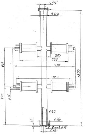 Рис. 1.4. Схема и габаритные размеры УЗ реактора ТР-1800/60 типа «крест» в блоке с преобразователями МСП: 1– преобразователи МСП; 2 – волноводы; 3– реактор.