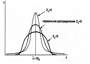 Так как распределение зависит от уровня вариации, т.е. от значений среднеквадратического отклонения, то кривая распределения будет иметь различные вершины. Эксцесс представляет собой выпад вершины эмпирического распределения вверх или вниз от вершины кривой нормального распределения (рис. 3).