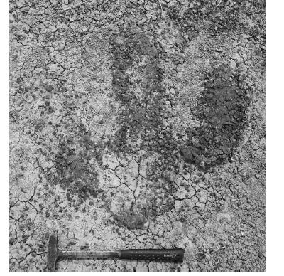 След предполагается, как принадлежащий Ти-Рексу в основном на основании аргумента отсутствия в экосистеме МСА других Теропод сходных размеров. Если след принадлежал Ти-Рексу, то габариты данной особи не были очень большими, уступая Стену и Сью. На основании соотношения длинны всех трех пальцев, масштабирование от Стена дает результаты: 8.34; 8.54; 6.75 метров для данного "Ти-Рекса"; на основании Сью - 9; 8.47; 7.44. Среднее для масштабирование от Стена - 7.87 метра; от Сью - 8.3 метра; среднее по обоим Ти-Рексам - 8 метров. Хотя, я уверен, что отпечаток лапы принадлежит не Тираннозавру рекс, конечно, тем не менее, очень приблизительные размеры в 8 метров, никого не напоминают? По моему мнению, след не приналежит Ти-Рексу, просто исходя из параметров уже известных других следов, которые всегда демонтрируют заметную "пятку", являющуюся опорной площадью сзади от пальцев; помимо того, для Ти-Рексов, и Тираннозаврид вообще, характерен особый узор стопы, который всегда очень хоршо отпечатывается, а кроме того, для Тираннозавров характерно то, что когти чаще всего хорошо отпечатываются. В данном случае на этой и других фотографиях данного следа "пятка" отпечатана хорошо. Но, она явно меньше, чем это у Тираннозавров. Вот - пример того, как выглядит след Ти-Рекса. Данный отпечаток происходит из формации Ланс, и он схож с отпечатком из формации Ратон в Мексике: