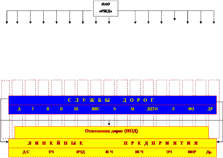 Рис. 1.1. Структура взаимодействия ОАО «РЖД» с железными дорогами Железная дорога – государственное производственное объединение, являющееся основной хозяйственной организацией железнодорожного транспорта. Руководит ею начальник дороги, подчиненный непосредственно президенту компании ОАО «РЖД». В управлении дороги на правах коллегиального органа управления работает технико-экономический совет, который состоит из специалистов различных отраслей транспорта, представителей производства. Начальник дороги и его заместители, осуществляют руководство службами по отраслям. Службы управления дороги, в свою очередь, руководят работой подразделений по отраслям в пределах своей дороги. Все службы управления дороги по производственным и техническим вопросам подчинены соответствующим департаментам и управлениям. В составе ОАО «РЖД» Российской Федерации имеются: 1. Департамент управления перевозками (ЦД); 2. Департамент локомотивного хозяйства (ЦТ); 3. Департамент вагонного хозяйства (ЦВ); 4. Департамент пути и сооружений (ЦП); 5. Департамент сигнализации, централизации и блокировки и связи (ЦШ); 6. Департамент электрификации и электроснабжения (ЦЭ); 7. Департамент грузовой и коммерческой работы (ЦМ); 8. Департамент пассажирских сообщений (ЦЛ); 9. Департамент материально технического обеспечения (ЦХ).
