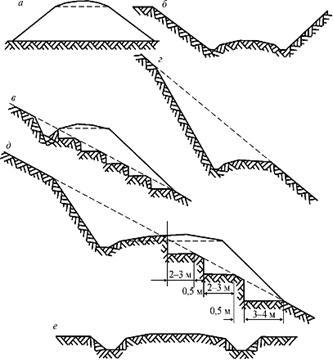 Рис. 3.3. Поперечные профили земляного полотна: а – насыпь; б - выемка; в – полунасыпь; г – полувыемка; д - полунасыпь-полувыемка; е - нулевое место