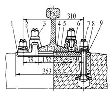 Рис. 4.3. Рельсовый стык: 1 – костыль; 2 – подкладка; 3- болт; 4 – накладка; 5 – рельс; 6 – шайба; 7 - гайка По расположению относительно шпал различают стыки на весу, на шпалах и на сдвоенных шпалах. В качестве стандартных приняты стыки на весу, обеспечивающие большую упругость и удобство подбивки балласта под стыковые шпалы. Так как с изменением температуры длина рельсов меняется, между торцами рельсов в стыках оставляют зазор, наибольшая величина которого во избежание сильных ударов колес подвижного состава не должна превышать 35 мм. Каждой температуре рельсов соответствует определенный стыковой зазор. Величина конструктивного (нормального) зазора должна быть в пределах 21-22 мм. На линиях с автоблокировкой на границах блок-участков устраивают изолирующие стыки, чтобы электрический ток не мог пройти от одного из соединяемых рельсов к другому. Для разделения рельсовых цепей на электрически изолированные друг от друга участки применяются изолирующие стыки следующих конструкций: сборные с объемлющими металлическими накладками; сборные с двухголовыми металлическими накладками; клееболтовые с двухголовыми металлическими накладками; клееболтовые с полнопрофильными металлическими накладками; клееболтовые с металлокомпозитными накладками; сборные с композитными накладками. Все остальные стыки на перегонах являются токопроводящими. Для улучшения токопроводимости применяют рельсовые соединители: стыковые, стрелочные, междурельсовые и междупутные. По способу прикрепления к рельсам стыковые соединители делятся на штепсельные, приварные и пружинные. Штепсельные и приварные стальные соединители применяют на неэлектрифицированных участках, оборудованных автоблокировкой. Медные стыковые приварные соединители применяют на участках электрической тяги с автоблокировкой. Рельсы к шпалам крепят с помощью промежуточных скреплений, которые должны обеспечивать надежную и достаточно упругую связь рельсов со шпалами, сохранять постоянство ширины-колеи и необходимую подуклонку рельсов, не допускать продольного смещения и опрокидывания рельсов. При железобетонных шпалах они должны, кроме того, обеспечивать электрическую изоляцию рельсов и шпал. Промежуточные скрепления бывают трех основных видов: нераздельные, смешанные и раздельные. При нераздельном скреплении (рис. 4.4, а) рельс и подкладки, на которые он опирается, крепятся к шпалам одними и теми же прикрепителями, а при смешанном скреплении (рис. 4.4, б) подкладки, кроме того, крепятся к шпалам дополнительными прикрепителями. Его преимуществами являются простота конструкции, небольшая масса, сравнительная легкость зашивки, перешивки и разборки пути. Однако такое скрепление не гарантирует постоянства ширины колеи и способствует механическому износу шпал. При раздельном скреплении (рис. 4.4, в) рельс крепится, к подкладкам жесткими или упругими клеммами и клеммными болтами, а подкладки к шпалам - болтами или шурупами. Достоинствами раздельных скреплений являются возможность смены рельсов без снятия подкладок, большое сопротивление продольным усилиям, обеспечение постоянства ширины колеи. Кроме того, раздельное скрепление не требует дополнительного закрепления пути от угона.
