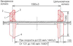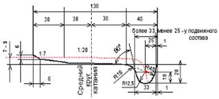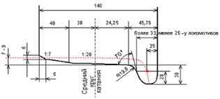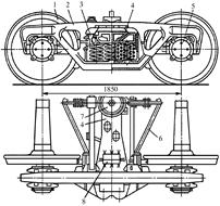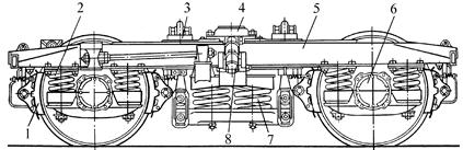 Двухосная тележка (рис. 7.1, б) состоит из двух колесных пар 1, четырех букс 5, двух литых боковых рам 2, двух комплектов центрального рессорного подвешивания 3, литой надрессорной балки 4 и тормозной рычажной передачи 6. Связь рамы с буксами — челюстная, кузов опирается на тележку через подпятник 7 надрессорной балки, а при наклоне кузова – дополнительно через скользуны 8. Надрессорная балка имеет подпятник 7, на который опирается пятник кузова, через их центры проходит шкворень, который служит осью вращения тележки относительно кузова, а также передает тяговые и тормозные силы от тележки кузову и обратно. Рессорное подвешивание состоит из двух комплектов, размещенных в рессорных проемах боковых рам. Буксы передают на колесные пары нагрузку от вагона. В корпусах букс расположены подшипники, внутренние кольца которых закреплены на шейках осей. Колесная пара вагона состоит из оси и двух цельнокатаных колес с диаметром 950 мм. Колесная пара локомотива состоит из оси и двух бандажных колес с диаметром 1050 мм по кругу катания. Ширина обода вагонного колеса – 130 мм, локомотивного – 140 мм. Для стабильного положения колесной пары в рельсовой колее при движении профилю поверхности катания придается определенное очертание. Стандартный профиль поверхности катания колеса характеризуется гребнем, толщиной 33 мм и конической поверхностью с конусностями 1:20, 1:7 и фаской 6 ´ 45º (рис. 7.1, в, г). Гребень колеса направляет движение и предохраняет колесную пару от схода с рельса. Конусность 1:20 центрирует колесную пару при движении на прямом участке пути и облегчает прохождение кривых участков. Конусность 1:7 приподнимает наружную грань колеса над головкой рельса, улучшая этим прохождение стрелочных переводов при наличии износа поверхности катания. Особенностью тележек современных пассажирских вагонов является наличие у них двойного рессорного подвешивания (рис. 7.2).