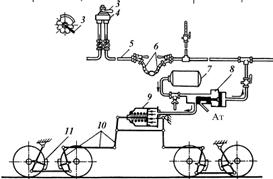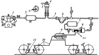 Рис. 7.2. Тележка КВЗ-ЦНИИ пассажирского вагона: 1 – тормозная колодка тележки; 2 – рессорное подвешивание надбуксовое; 3 – скользун; 4 – подпятник; 5 – рама; 6 – букса; 7 – рессорное подвешивание центральное; 8 – гидравлический гаситель колебаний Тормозами называют устройства, предназначенные для получения регулируемых дополнительных сил сопротивления движению подвижного состава или удержания его на месте. Тормоза подвижного состава железных дорог подразделяются на фрикционные и электрические. Наибольшее распространение получили в подвижном составе железных дорог фрикционные тормоза, принцип действия которых основан на создании искусственного сопротивления движению поезда за счет сил трения, возникающих между колесами и прижимающимися к ним тормозными колодками. По способу управления и источнику энергии для прижатия тормозных колодок фрикционные тормоза подразделяются на пневматические, электропневматические и ручные. Основным видом фрикционного тормоза, применяющегося на подвижном составе железных дорог, является пневматический, принцип действия которого основан на создании разности давлений сжатого воздуха в камерах приборов управления тормозами. Пневматические тормоза подразделяются на неавтоматические прямодействующие, автоматические непрямодействующие и автоматические прямодействующие. Неавтоматические прямодействующие тормоза применяются в качестве вспомогательных для торможения только локомотивов при выполнении ими маневровой работы. Торможение основано на подаче сжатого воздуха непосредственно в тормозной цилиндр. Для отпуска тормозов тормозной цилиндр сообщают с атмосферой. Весь подвижной состав железных дорог оборудован автоматическими тормозами. Автоматическими непрямодействующими тормозами оборудованы локомотивы и вагоны, предназначенные для перевозки пассажиров. Автоматическими прямодействующими тормозами оборудованы локомотивы и вагоны грузового парка железных дорог. Управляют тормозами при помощи крана машиниста. Автоматический непрямодействующий тормоз (рис. 7.3, а) заряжают перед отправлением поезда, устанавливая ручку 3 крана машиниста в положение отпуска. При этом воздух, проходя по тормозной магистрали 5 через воздухораспределитель 8, заполняет запасной резервуар 7 до зарядного давления. Одновременно с этим воздухораспределитель соединяет тормозной цилиндр с атмосферой. Под действием пружин тормозного цилиндра его поршень, перемещаясь в исходное положение через рычажную передачу 10, отводит тормозные колодки 11 от колес.