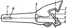 Рис. 7.4. Корпус автосцепки в сборе: 1 – большой зуб; 2 – замкодержатель; 3 – замок; 4 – малый зуб; 5 – выступ; 6 – отверстие для клина; 7 – торец хвостовика