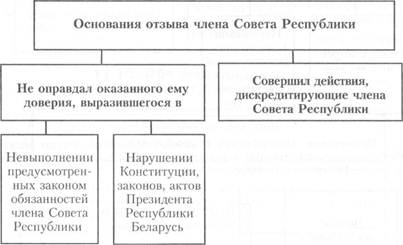 Примечание. При наличии указанных оснований член Совета Республики, избранный от области, города Минска, может быть отозван в порядке, установленном Избирательным кодексом Республики Беларусь (раздел IX). Порядок отзыва члена Совета Республики, назначенного Президентом Республики Беларусь, устанавливается Президентом Республики Беларусь.