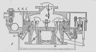 1. Типи карбюраторів і поплавкових камер. В залежності від направлення повітряного потоку і пальної суміші розрізняють карбюратори з падаючим, визхідним (восходящим) або горизонтальними потоками. В більшості випадків на карб. двиг. використовують карбюратори з падаючим потоком, які забезпечують краще наповнення цил. пальної сумішшю і дещо більшу потужн. двигуна. Покращення наповнення циліндрів і підвищення потужності двигуна відбув, внаслідок більш вдосконаленої конструкції впускного трубопроводу і меншого опору його руху горючої суміші. Крім того впускний патрубок карбюратора розміщен. так, що на ньому зручно встановлювати повітряний фільтр, легше проводити ТО. В цьому випадку простіший і привід управління карбюратором. Якщо поплавкова камера сполучається з оточуючим повітрям, то при зміні опору повітр. фільтра (при забрудненні) зростає розрідження в дифузорі, і пальна суміш значно збагачується. Таку поплавкову ккамеру називають незбалансованою. Поплавкові камери, з'єднані каналом з повітряним патрубком називають збалансованими (врівноваженими) їх виконують герметичними. При порушенні герметичності поплавкової камери пальна суміш збагачується, що приводить до збільшення витрат палива і підвищення токсичності відпрацьованих газів. Якщо поплавкова камера незбалансована, то необхідно уважно слідкувати за станом повітряного фільтра. 2. Будова і робота карбюраторів К-151 та К-90 (К-88А).