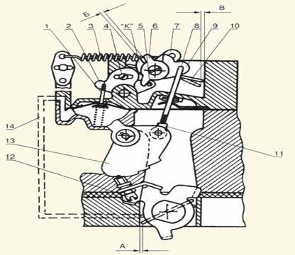 Рис, 2.70 Схема пускового пристрою карбюратора К-151: 1 - шток діафрагмового механізму; 2 - ліва частина двоплечого важеля пускового пристрою; 3 - пружина закривання повітряної заслінки: 4 - стяжний гвинт двоплечого важеля; 5 - вусик на правій частині двоплечого важеля; б - важіль-обмежувач відкривання повітряної заслінки; 7 - важіль на задньому кінці осі повітряної заслінки (для її закривання); 8, 11 - тяга з різьбовою головкою; 9 -проміжний важіль: 10 -повітряна заслінка; 12 - гвинт-обмежувач відкривання дросельної заслінки; 13 -кулачок; 14 - канал підведення розрідження до діафрагми пускового пристрою; А, Б. В -зазори; К - виступ важеля 9