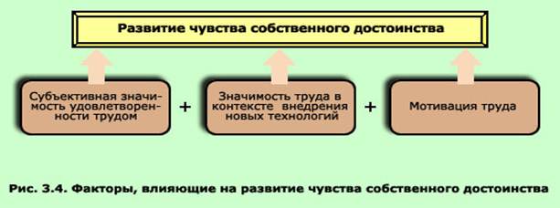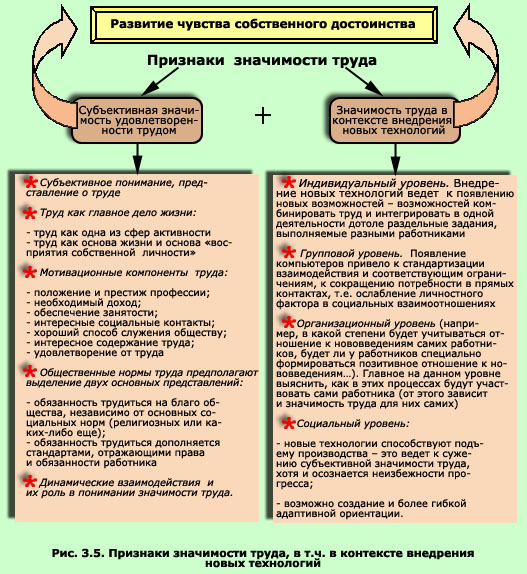 Тема субъективной значимости труда приближает к главной проблеме данной книги - проблеме развития чувства собственного достоинства работника, обоснованно гордящегося своим трудом. Именно развитие чувства собственного достоинства является, по нашему мнению, важнейшим условием собственно личностного развития человека в труде (см. рис. 3.4). При рассмотрении темы субъективной значимости труда сразу же возникает много сложностей: 2) Само представление о субъективной значимости труда меняется со временем, проходя часто критические периоды. Например, творческий работник всегда чем-то недоволен в своей работе, а нередко вообще считает ее "никому не нужной"… 3) Во многих случаях реально существует "частичная значимость" конкретного труда, когда работник, например, ценит себя и свой труд не за пользу, которую он своим трудом приносит окружающим, а за те блага (гонорары), которые он с этого получает. И этим он гордится, и этим он самоутверждается… 4) Чувство субъективной значимости может основываться и на самообмане, когда разумом человек уже готов согласиться с тем, что его работа примитивна или общественно бессмысленна, но признаться себе в этом у человека просто не хватает сил. И тогда на уровне чувств он по-прежнему продолжает верить в "значимость" своего труда как для себя лично, так и для окружающих и т.п. Само понятие "значимость труда" встречается в литературе уже более 30 лет, но до сих пор нуждается в серьезном обосновании. Руис С.А. Куантанилла, Б. Вилперт выделяют следующие основные составляющие понятия "значимость труда" (см. Леонова, Чернышева, 1995. С. 262).: субъективный смысл трудовой деятельности; мотивация; место труда в жизни индивида; основные роли в трудовой деятельности. 3. Мотивационные компоненты труда. Часто обследуемым предлагаются перечни мотивационных факторов труда - например, перечень значимых функций труда (по Каплану и Тайсни): положение и престиж профессии; необходимый доход; обеспечение занятости; интересные социальные контакты; хороший способ служения обществу; интересное содержание труда; удовлетворение от труда. Любопытно, что самым значимым фактором оказался "необходимый доход". Другой способ оценки мотивационных компонентов - различные характеристики труда: техника безопасности; сочетание требований деятельности и соответствующей им квалификации; хорошая оплата; хороший социально-психологический климат; хорошие физические условия; автономность (независимость) работника. Развитие производства ставит задачу исследования проблемы значимости труда в контексте внедрения новых технологий (Там же. С. 271-272). Сразу же следует сделать некоторые замечания: отношения между новыми технологиями и значимостью труда пока плохо исследованы; может так оказаться, что изменение смысла труда и появление новых технологий носит случайный характер; поэтому представленные ниже рассуждения Руис С.А. Куантаниллы и Б. Вилперта - лишь попытка упорядочить представления об их взаимосвязи на разных уровнях организации труда: 1. Индивидуальный уровень. Внедрение новых технологий ведет к появлению новых возможностей - возможностей комбинировать труд и интегрировать в одной деятельности дотоле раздельные задания, выполняемые разными работниками. На более высоких уровнях появляется возможность передавать функции сложным ме