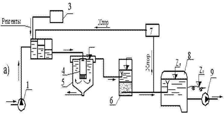 а – с вертикальными отстойниками и скорыми фильтрами; б – с осветлителями и фильтрами; в – с горизонтальными отстойниками и фильтрами. 1 – насосная станция I подъема; 2 – смесители; 3 – реагентное хозяйство; 4 – водоворотная камера хлопьеобразования; 5 – вертикальный отстойник; 6 – скорые фильтры; 7 – хлораторная; 8 – резервуары чистой воды; 9 - насосная станция II подъема; 10 – осветлители; 11 – камера хлопьеобразования; 12 – горизонтальные отстойники Для уменьшения стоимости строительства станции водоочистки ее отдельные сооружения следует приспосабливать к рельефу местности с учетом обеспечения незатопляемости площадки и возможности самотечного отвода сточных вод и осадков из всех сооружений. Диаметры труб соединительных коммуникаций определяют в зависимости от величины расчетного расхода воды и допускаемых скоростей ее движения