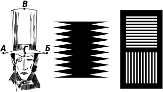 Ваши ошибки в оценке вызваны целостностью восприятия Высота дерева, скалы, дома, заводской трубы, вообще любого предмета из‑за закона перспективы всегда воспринимается меньшей, чем она есть на самом деле. Поправка, которую мы привыкли вносить, приводит к переоценке длины вертикальных линий по сравнению с горизонтальными. Поэтому на нашем рисунке высота шляпы кажется больше ширины ее полей, а высота фигуры рядом с ней – больше ее ширины. Эта иллюзия настолько стойка, что при изготовлении типографских шрифтов ее приходится учитывать. С ней считаются и архитекторы при проектировке украшений зданий. Иллюзия высоты и ширины