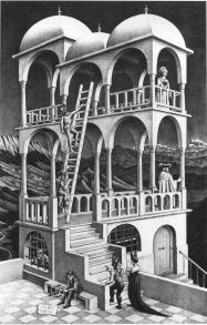 Загадки Эшера Голландский гравер Морис Эшер (1898‑1971) прославился созданием живописных парадоксов: рисунков‑иллюзий геометрически невозможных объектов, противоречащих здравому смыслу. Его фантастические картины взволновали умы математиков XX в. Ниже – рисунки «невозможного дома» и «лестницы», обрекающей идущего по ней на бесконечный подъем или спуск.