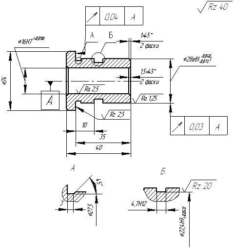 Підрізати другий торець в розмір 40, точити і розточити фаски. Розгорнути отвір Ø16Н7 (+0,018) остаточно