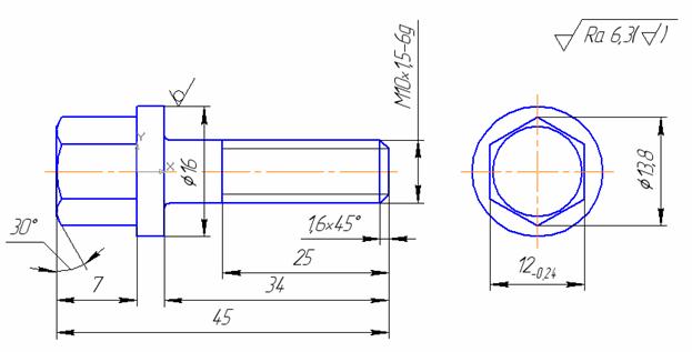 Точити шийку під нарізку М10х1,5-6g до Ø8,99-0,08 під накатування, точити фаски, точити шийку Ø13,8 під шестигранник. Відрізати деталь, витримуючи розмір 45,5
