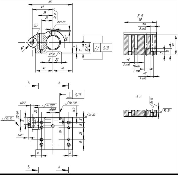 Перша позиція: фрезерувати поверхню прилягання й паз В=35 (15+20) остаточно, свердлити чотири отвори Ø7, два отвори Ø6, свердлити й нарізати нарізку в двох отворах М6-7Н.