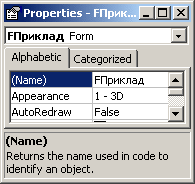 Радимо Вам спочатку не приєднувати до стандартної лінійки інструментів нічого додаткового — нехай вона буде мати вид, показаний на мал. Д1.6. У міру підвищення Вашої майстерності програмування Ви зможете поступово збільшувати і Ваш запас інструментів. Відзначимо, що в рядку заголовка Головної панелі проекту на мал. Д12 — Д14 змінилися назва проекту і назва форми (за замовчуванням ними були Project l і Form l, а тепер ними стали РПриклад і FПриклад). Такі зміни потрібно зробити обов'язково, якщо Ви хочете зберегти Вашу форму і Ваш проект для подальшої роботи над ними. Зробити це можна так. У Вікні провідника проекту (Project Explorer) варто клацнути мишею рядок з ім'ям файлу проекту. У Вікні властивостей проекту (Properties), що при цьому відкриється, варто змінити значення єдиної його властивості (Name) — замінити слово Project l на обране Вами ім'я, наприклад, на РПриклад (мал. Д1.15, а). Аналогічно варто надійти і зі значенням властивості (Name) екранної форми — замінити слово Form l на обране Вами ім'я, наприклад, на РПриклад (мал. Д1.15, б).