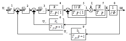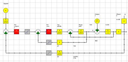 Максимальное напряжение тиристорного преобразователя UВ принято равным 280 В, а максимальное напряжение регулятора тока Uу – 10 В. Постоянная преобразователя принята равной 0,01 с. (Здесь и далее унифицированный уровень напряжения принят равным 10 В; на этом уровне ограничены задающие напряжения и выходные напряжения датчиков и регуляторов. В действительности уровень ограничения напряжения для различных элементов системы может быть разным, что должно учитываться при расчетах параметров модели и вводе ограничений. Будем считать обратную связь по току безынерционной, т.е. ТДТ =0. Коэффициент обратной связи по току рассчитан по формуле: