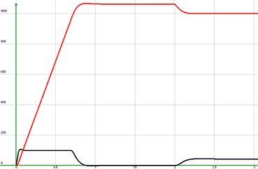 Таким образом, рассмотрены все звенья модели, представленной на рис.9.1 (файл OSS1.sa и макрос mc_pirt1.sa). Моделировались два последовательных режима: отработка задающего напряжения UЗ = 7 В на холостом ходу в течение 2 секунд и последующее ступенчатое приложение нагрузки -43 А. Длительность второго режима 1 с. Расчет проводился с шагом интегрирования 0,001 с. Результат, выведенный на график, представлен на рис.9.2. Согласно графику, статическая просадка скорости при приложении нагрузки составила примерно 60 об/мин.