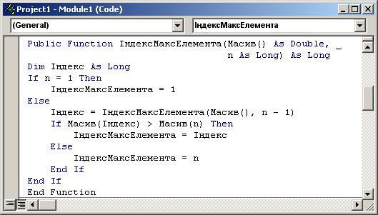 У розд. 3.1 була розглянута задача сортування всього трьох чисел. А якщо чисел багато (20, 100, 100000)? Немає потреби пояснювати, що як при декларативному, так і при процедурному способі вирішенні цієї задачі виникнуть проблеми. Про розв'язок однієї з них (збереження великої кількості різних чисел у масивах) йшла мова раніше. Друга проблема полягає в тому що в розглянутих алгоритмах кількість порівнянь буде різко зростати зі збільшенням кількості порівнюваних чисел (згадайте відповіді на питання до попереднього розділу). Вирішення другої проблеми — тема цього і наступних розділів даної глави. По-перше, як і в інших алгоритмах, розглянутих в попередній главі, в алгоритмах сортування можна використовувати вже знайомі Вам цикли — повторювані не дуже складні комбінації порівнянь чисел. І від кількості чисел буде залежати не кількість порівнянь на одному кроці циклу, а тільки кількість цих кроків. По-друге (і це головна тема даної глави), в алгоритмах сортування ми будемо застосовувати ідею рекурсії. Спочатку вирішимо більш просту задачу, алгоритм якої ми дуже коротко описали на початку глави, — задачу рекурсивного пошуку максимального з N чисел. Використовуючи цей алгоритм, визначимо рекурсивну функцію МаксЕлемент, що буде повертати максимальний елемент одномірного масиву Масив. Аргументів у цієї функції два: Масиви і n (сам масив і число його елементів).