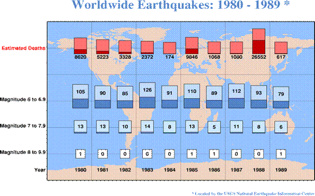 Рис.4.8. Всесвітні землетруси: 1980-1989 рр.