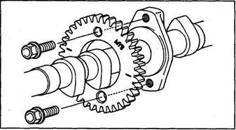 Распределительные валы (CB400N). 1 - заглушка, 2 - кольцевое уплотнение, 3 - заглушка, 4 - кольцевое уплотнение, 5 - болт крышки подшипников распределительного вала, 6 - успокоитель цепи, 7 - крышка подшипников распределительного вала, 8 - установочный штифт, 9 - распределительный вал впускных клапанов, 10 - распределительный вал выпускных клапанов.