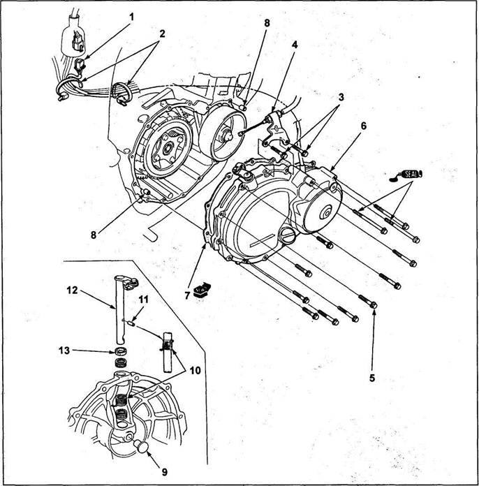 Крышка картера сцепления (Honda CB400N). 1 - разъем генератора, 2 - зажим проводки, 3 - болт кронштейна троса сцепления, 4 - трос сцепления с кронштейном, 5 - болт крепления крышки картера Сцепления, 6 - правая крышка картера сцепления, 7 - прокладка, 8 - установочная втулка, 9 - нажимная пята, 10 - возвратная пружина, 11 - фиксатор пружины, 12 - шток выключения сцепления, 13 - пыльник.