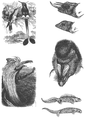 (По часовой стрелке, начиная от верхнего левого угла: (1) Spathura underwoodi, слева — самка, справа — самец. (2) Chamaeleo owenii, рогатый хамелеон, вверху — самец, внизу — самка. (3) Голова самца мандрила. (4) Triton cristatus, гребнистый тритон, вверху — самец, внизу — самка. (5) Paradisea papuana, самец райской птицы) Рис. 5.1. Примеры видов с выраженным половым диморфизмом, сформировавшимся в ходе полового отбора. (адаптировано из The Descent of Man, 1871)