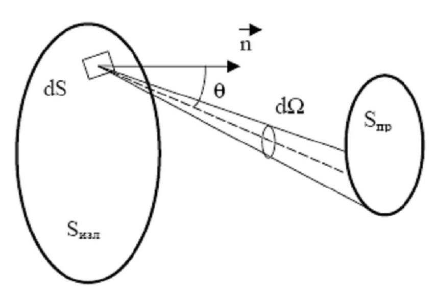 Для чёрного тела можем записать Для черного тела полный поток излучения можно найти если измерить поток в небольшом телесном угле Принципиальная схема измерений дана на рис. 3. Излучатель площади