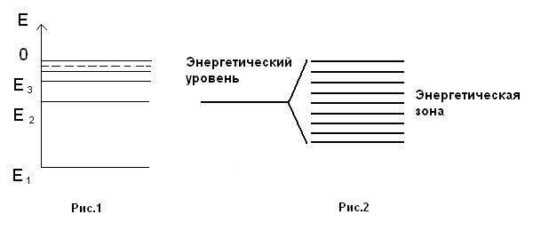 Для образования кристалла будем «мысленно» сближать N изолированных атомов. Взаимодействие электрона со всеми N атомами кристалла приводит к изменению энергии электрона. Каждый энергетический уровень атома расщепляется на N уровней, и образуются энергетические зоны (см. рис.2).