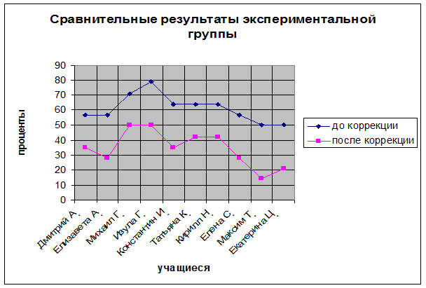После проведения психокоррекционной работы у экспериментальной группы наблюдается снижение уровня тревожности, по сравнению с данными констатирующего эксперимента, приблизительно на 15 - 30%, что можно увидеть в следующей диаграмме (рис. 5).