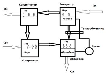Принцип работы одноступенчатого абсорбционного теплового насоса.