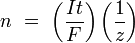 где: m — масса осаждённого на электроде вещества в граммах Q — полный электрический заряд, прошедший через вещество F = 96,487 C mol−1 — постоянная Фарадея M — молярная масса вещества z — валентное число ионов вещества (число электронов на один ион). Заметим, что M/z — это эквивалентная масса осаждённого вещества. Для первого закона Фарадея M, F и z являются константами, так что чем больше величина Q, тем больше будет величина m. Для второго закона Фарадея Q, F и z являются константами, так что чем больше величина M/z (эквивалентная масса), тем больше будет величина m. В простейшем случае постоянного тока электролиза Q = It приводит к: