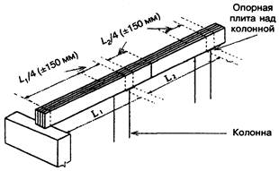 6.2.6.2 Соединение прогонов составного сечения встык должно располагаться над опорой. Допускается использовать неразрезные прогоны (на 2 или более пролетов). Элементы таких прогонов (отдельные доски) должны соединяться встык на расстоянии четверти пролета от опоры ±150 мм в соответствии с рисунком 6-2. Элементы прогона, соединяемые на расстоянии четверти пролета от одной опоры, должны быть непрерывными над соседней опорой.