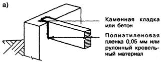 6.2.8.3 Элементы деревянного каркаса перекрытий, опирающиеся на бетон или кладку, рекомендуется изготовлять из обработанных антисептиками пиломатериалов. Допускается применять не обработанные антисептиками пиломатериалы при соблюдении указанных на рисунке 6-3, а требований к заделке концов всех прогонов и балок, низ которых расположен выше уровня земли. В тех случаях, когда низ прогонов и балок из не обработанных антисептиками пиломатериалов находится на уровне или ниже уровня грунта, у их торцов, заделываемых в каменную кладку или бетон, должны оставляться незаполненные воздушные зазоры шириной не менее 10 мм, а опорная поверхность балок и прогонов должна быть отделена от бетона или кладки гидроизоляционным материалом (рисунок 6-3, б). Во всех случаях использования не обработанных антисептиками пиломатериалов наружные поверхности стен из бетона или кладки должны быть изолированы от проникновения влаги. 6.2.8.4 Нижняя опорная доска сечением не менее 38х88 мм должна укладываться на фундаментную стену по уровню на слой строительного раствора или на уплотняющую прокладку из герметизирующего материала. Опорная доска должна крепиться к фундаментной стене анкерными стальными болтами диаметром не менее 12 мм по ГОСТ 1759.0. Анкерные болты должны размещаться с шагом, определяемым по расчету, но не более 2,4 м, закрепляться на нижней обвязке каркаса с помощью гаек и шайб и заделываться в фундамент на глубину не менее 100 мм (рисунок 6-4). 6.2.8.5 Балки и прогоны междуэтажных перекрытий опираются на верхние обвязки каркаса несущих стен. К их торцам прибивают обвязочные балки таким образом, чтобы наружная грань обвязочной балки находилась в одной плоскости с наружной стороной каркаса стены (см. пример на рисунке 6-6). 6.2.8.6 Опирание балок перекрытий на прогоны может осуществляться либо по верху прогонов (рисунок 6-7), либо путем их прикрепления к боковым граням прогонов. Первый из этих вариантов применяется в основном в перекрытии над подвалом, когда концы прогонов заделываются в каменную или бетонную фундаментную стену. При этом стыки балок перекрытия устраиваются внахлест. Для междуэтажных и чердачных перекрытий предпочтителен второй вариант опирания балок. 6.2.8.7 При креплении балок к боковой поверхности деревянных прогонов опирание осуществляется либо на металлические угловые накладки, либо на деревянные опорные бруски, прибитые гвоздями к боковой поверхности прогонов. Варианты крепления балок к боковой поверхности прогонов указаны на рисунке 6-8.