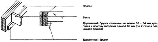 6.2.8.8 При креплении деревянных балок к стальным прогонам они должны опираться на нижнюю полку прогона или на подкладной брусок сечением не менее 38х38 мм, прикрепляемый к стенке прогона болтами диаметром 6 мм с шагом 600 мм (рисунок 6-9). Балки должны соединяться над прогоном с помощью соединительного бруска сечением не менее 38х38 мм и длиной не менее 600 мм для опирания черного пола над прогоном. Между этим бруском и верхней поверхностью прогона должен оставляться зазор не менее 10 мм (на случай усадки деревянных балок). 6.2.8.9 Балки перекрытия, опирающиеся на стальные прогоны, должны удерживаться от скручивания и коробления забивкой у каждого конца балки гвоздей под углом, загибаемых за полку прогона, либо устройством непрерывной обвязки из досок по низу балок у опор, либо созданием системы вертикальных перекрестных связей между балками в соответствии с 6.2.9.
