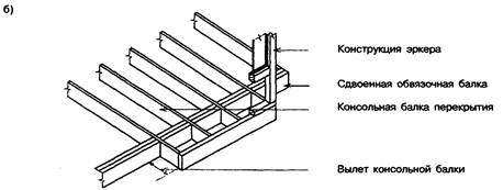 а — консольные балки расположены перпендикулярно балкам перекрытия; б — консоли являются продолжением балок перекрытия