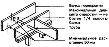 13.4.1 Трубы и вентиляционные короба необходимо прокладывать под балками или между элементами каркаса (рисунок 13-4). Размер отверстия в балках не должен быть больше четверти высоты балки (рисунок 13-5).