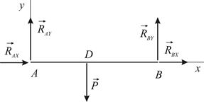Нужно определить шесть составляющих реакций шарниров. Для получения необходимых для этого шести уравнений можно рассмотреть равновесие всей конструкции и одного из стержней или равновесие каждого из стержней. С точки зрения удобства вычисления плеч сил, предпочтительнее рассмотреть равновесие каждого из стержней. Рассмотрим равновесие стержня