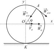 Колесо радиуса катится без скольжения по прямолинейному пути (Рис. 2.11). Ось колеса движется ускоренно, имея в данный момент времени скорость и ускорение . Определить проекции ускорение любой точки обода колеса на оси координат.