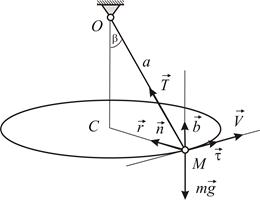 Груз массы , подвешенный на нити длины , другой конец которой закреплен в точке , представляет собой конический маятник, т.е. описывает окружность в горизонтальной плоскости (Рис.1.1). Нить образует с вертикалью угол . Определить скорость груза и силу натяжения нити .