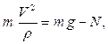 Рассмотрим автомобиль в верней точке моста. Силы, действующие в направлении касательной к траектории – сила трения, сила сопротивления воздуха неизвестны. В направлении главной нормали к траектории действуют известная сила тяжести и нормальная реакция опоры, которую и требуется определить. Поэтому запишем уравнение движения в проекциях на главную нормаль к траектории. В рассматриваемом случае это уравнение принимает вид: