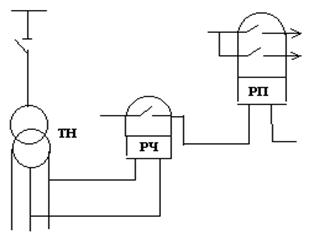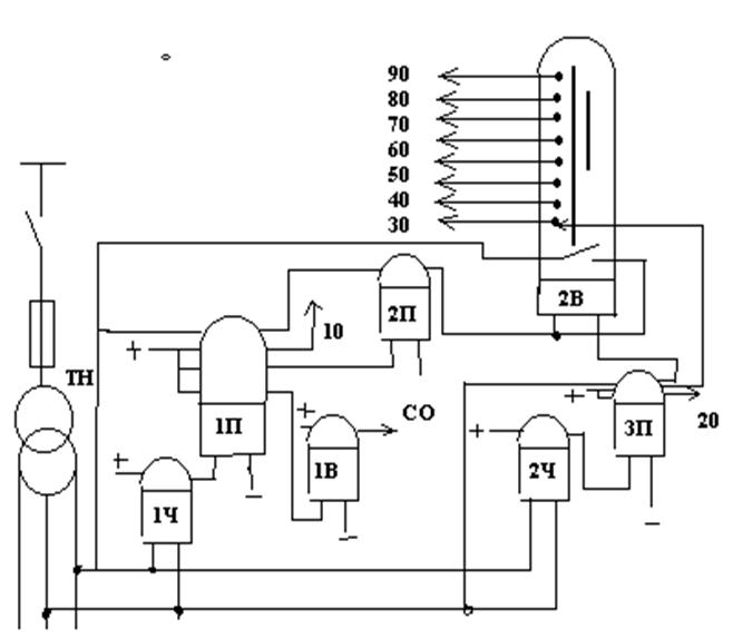 Рис. Схема устройства АЧР по абсолютному значению частоты. Первый метод АЧР чаще всего применяется в системе электроснабжения промышленных предприятий. Он заключается в срабатывании реле частоты РЧ при определенном её значении, задаваемом энергосистемой, что приводит к отключению части потребителей через промежуточное реле РП. Второй метод АЧР с отключением потребителей в определенной очередности применяется обычно в энергосистемах. При снижении частоты срабатывает частотное реле 1Ч, которое через промежуточное реле 1П дает импульс (без выдержки) на отключение первой очереди потребителей (контакты 10). Одновременно получает питание через промежуточное реле 2П специальное электродвигательное реле времени 2В. Если после отключения первой очереди потребителей частота в сети не восстанавливается, то срабатывает частотное реле 2Ч и отключается вторая очередь через промежуточное реле 3П (контакты 20). Далее через контактное кольцо электродвигательного реле 2В отключаются остальные очереди (контакты 30-90). Если после отключения указанных очередей не восстанавливается до номинального уровня, то через реле 1В с максимальной выдержкой времени отключается последняя специальная очередь потребителей (контакты СО).